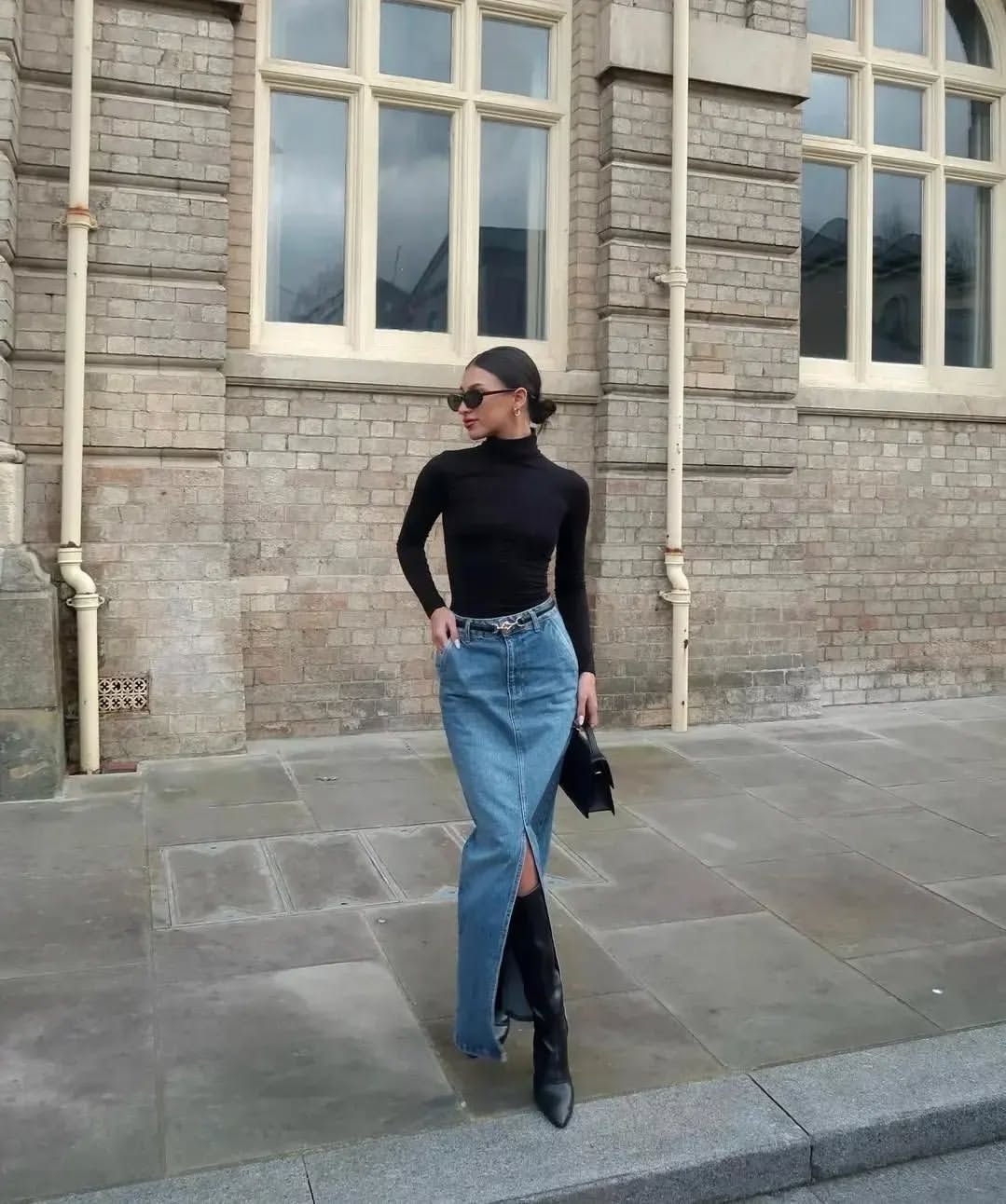 The combination of casual and professional elements in this ensemble creates a stylish alternative to traditional office attire. The addition of statement blouses and mules allows you to transform your denim skirt into a suitable outfit for different professional settings, which adapt well to office environments.